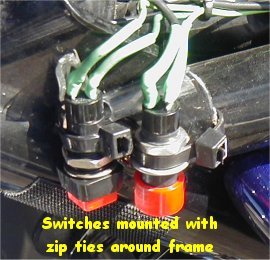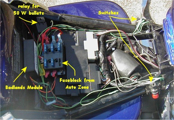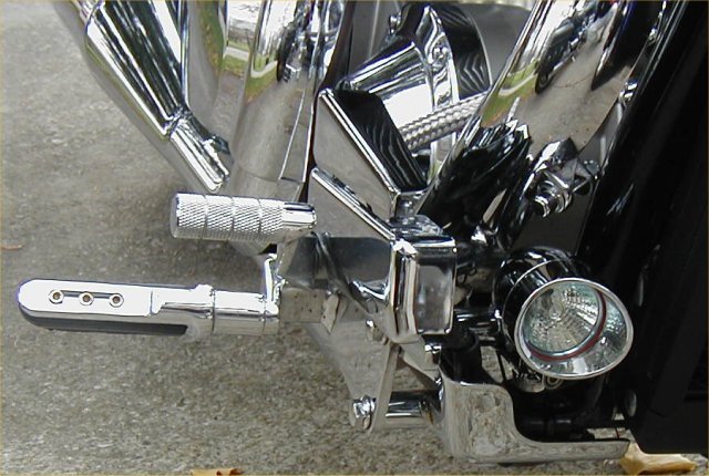 Kuryakyn Large Universal Silver Bullets (2320) are mounted to the upper peg plate spacers with "made myself" brackets. I was going for "minimal" which is my theme for this bike and wanted the brackets to be mostly invisible. They could easily be mounted with any bracket that will mount on 7/8" bars (J&P offers a three piece 7/8" clamp that should work). The switch is under the seat and the lights work off of a realy wired similar the description found on my Foglites pages. These lights when lit show a good face to other drivers and they are just as much for me TO BE SEEN as for me to see.