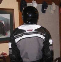 HERE'S HOW IT LOOKS IN PLACE AND IT WORKS! for scrollable printable pic. Mount the visor on low enough so that it will go over your collar but high enough so it will not interfere with head turning. Cool thing about a visor is that it's curved. It will not pick up any air from the front to direct it underneath, it will not hamper the "head in the direction of your turn" proper riding technique and does not snag on anything much at all. The only thing it does prevent is stargazing which you shouldn't do while riding anyway! Here's a view of it with my FIRSTGEAR riding jacket. |