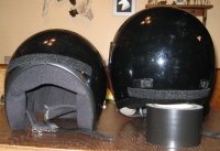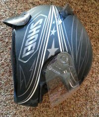 Here are side views of the finished product on both my HJC open face and Shoei full face. Note that I used only one visor which can be swapped from helmet to helmet. Note also that the visor must be FLEXIBLE so that easy removal is possible - just start at one end and zzzzip! The use of Velcro serves another purpose: Should you be unfortunate enough to have an accident, the visor will likely just pop off, preventing any injury from it. |