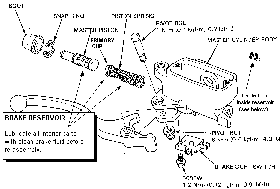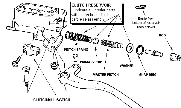 Remove the snap ring with snap ring pliers or small needle nose pliers ground down to fit the holes in the ring. The snap ring fits in a groove in the reservoir body and the ring is squeezed "in" to R&R. Before shipping the reservoir body, make sure to remove the ''figure eight'' baffle in the center bottom inside of the reservoir. It simply pulls out gently with those same needle nose pliers. Also remove the sight glass (see below). The primary cup, which is slightly cone shaped, is oriented with its "fat" end toward the spring (it fits on the spring like a cap). The "fat" end of the spring is inserted first as the picture shows. Be careful that you don't forget the washer in the clutch reservoir. Lubricate all interior parts with clean brake fluid (DOT 4) before re-assembly. The boots should be lubricated with silicon (non petroleum) grease. Click here to see chrome reservoirs in installed on NightMare. Please look in your service manual for complete instructions. Sections 9-0, 9-6,7 and 15-10 |